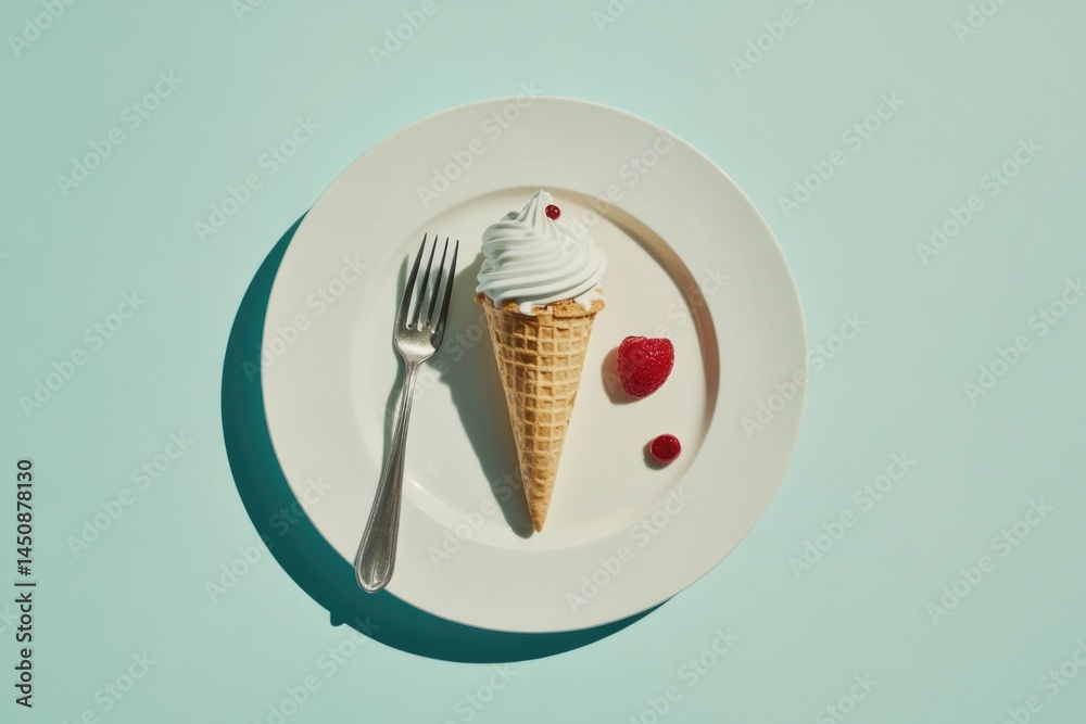 A delightful image showcasing a single ice cream cone topped with whipped cream and a cherry, styled elegantly on a clean white plate against a soft pastel background. #1450878130