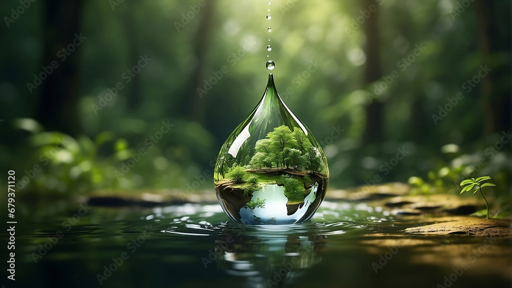 A drop of water with a green oasis of plants inside against the green of the forest, symbolizes nature, environmental disaster and climate change. The concept of conservation #679371120
