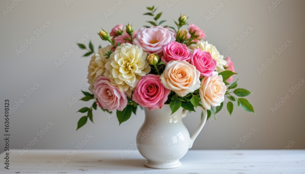 A floral arrangement in a white ceramic pitcher filled with hydrangeas and garden roses set against a neutral backdrop #1636498123