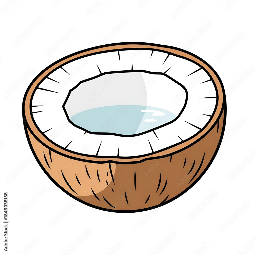 A halved coconut with white flesh and clear water inside, depicted in a simple cartoon style #1849038158
