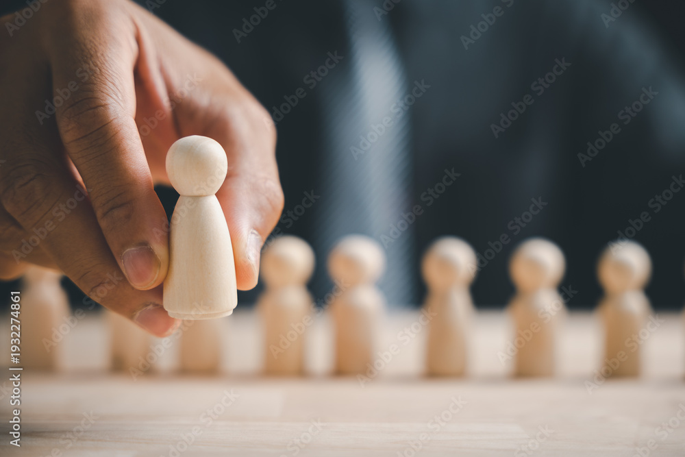 A hand holding a small wooden figure in front of a row of similar figures. The background is blurred. #1932274861