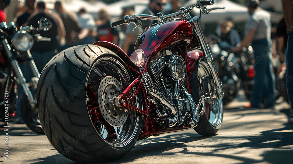 A heavily modified chopper with extended forks and custom paint standing out at a motorcycle show. #1029404700