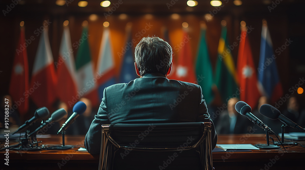 A leader addressing a conference with national flags in the background, capturing the essence of diplomacy and decision-making. #917088247