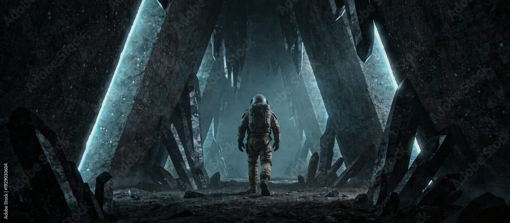 A lone astronaut exploring a dark, jagged crystalline cave with gritty noise texture and high-grain teal and black finish. Moody volumetric lighting creates atmospheric cinematic composition as sharp #1929030604