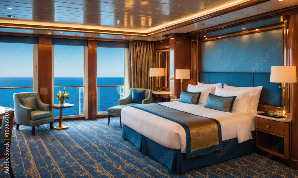 A luxurious cruise ship cabin with a stunning view of the ocean #1075771079