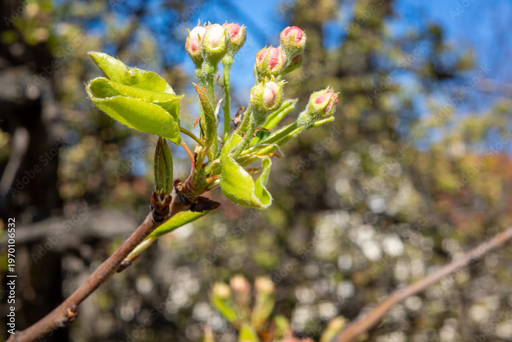 A macro shot captures delicate pink and white flower buds of a fruit tree emerging from soft green leaves against a vibrant blue sky, signaling the arrival of spring. #1970106532