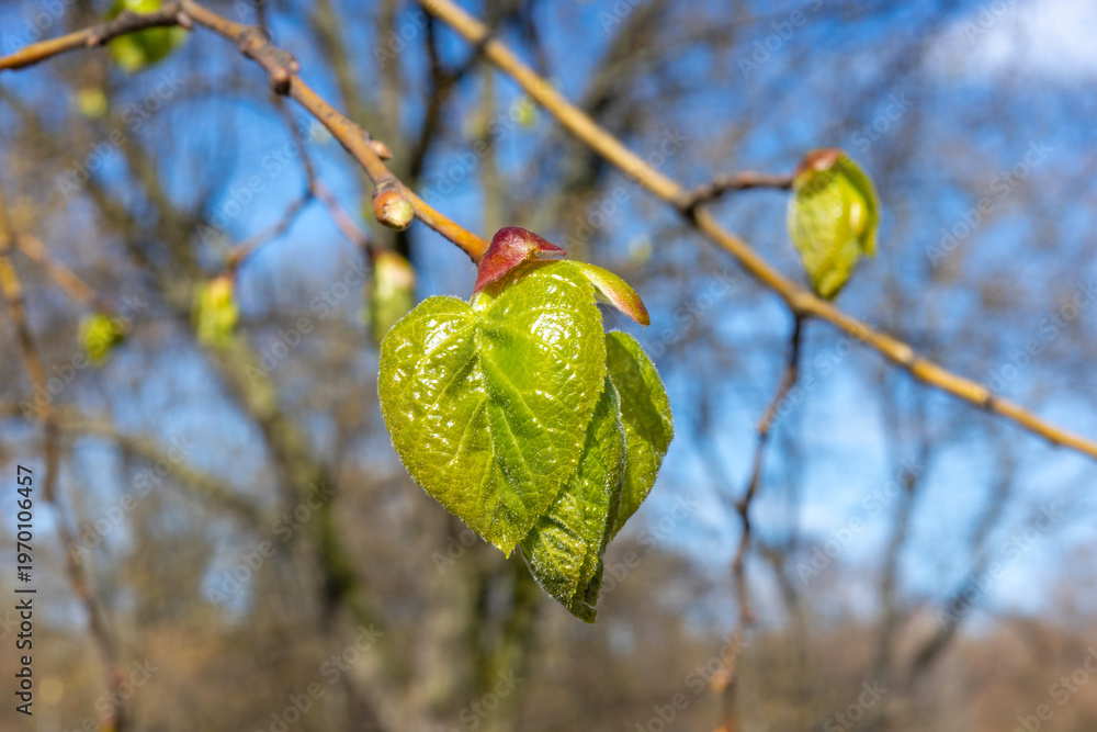 A macro shot captures fresh green linden leaves emerging from reddish buds on a slender branch against a blurred blue sky, symbolizing the vibrant arrival of spring. #1970106457