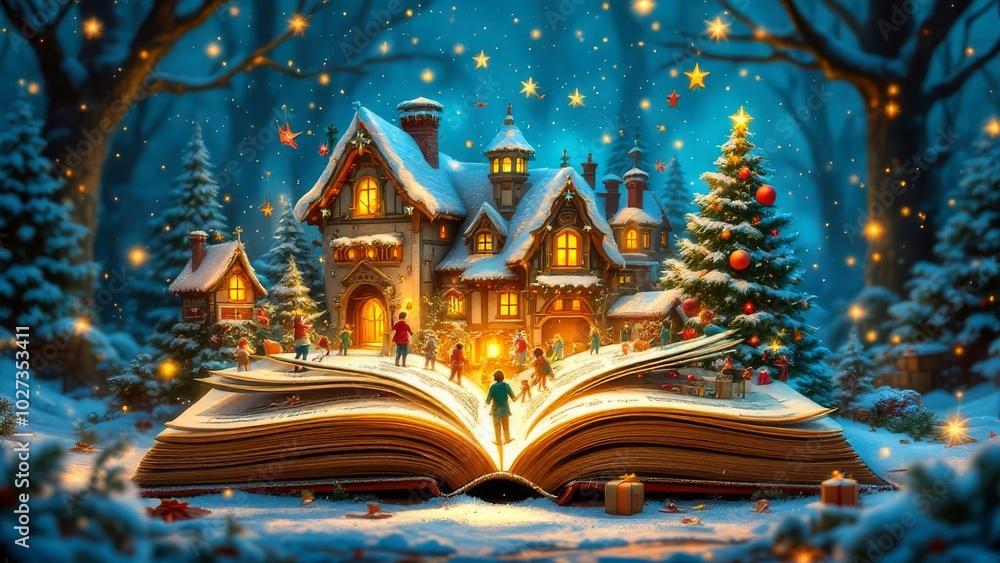• #1027353411 A magical winter scene with a large open book transforming into a festive village under a starry sky.