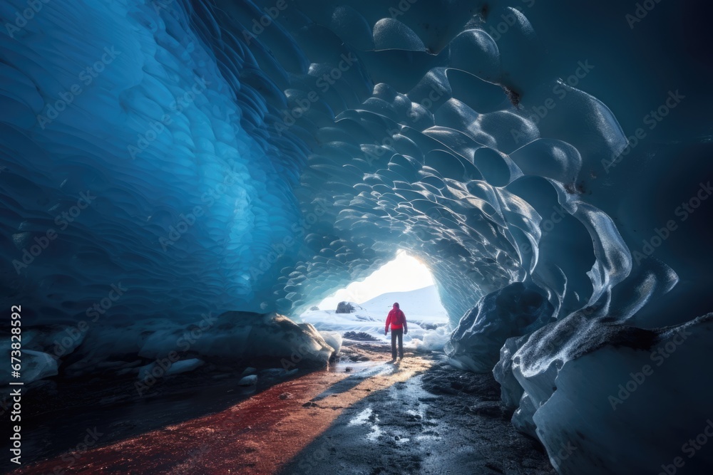 A man explore freezing ice covered cave. Winter seasonal concept. #673828592