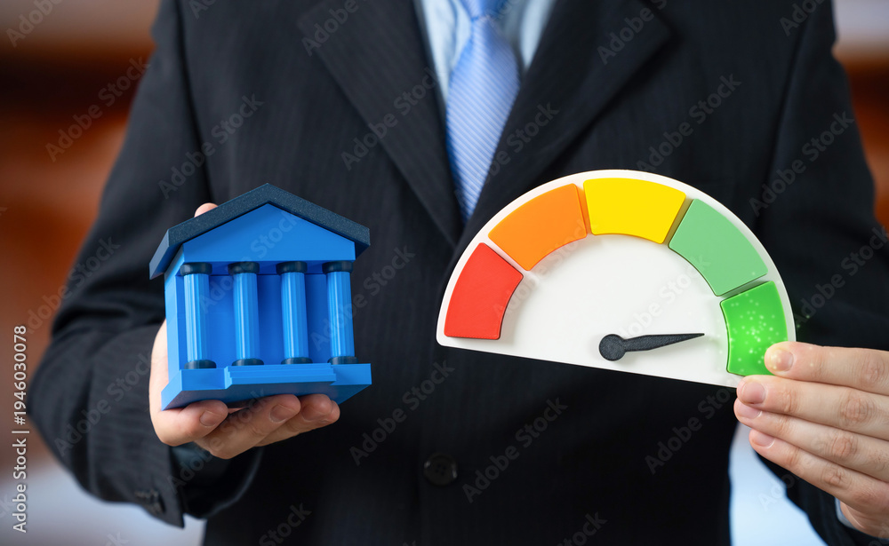 A man in a suit holds a bank and a performance scale showing the highest green level. High liquidity of bank assets and financial stability. Strong banking sector supports economic growth. #1946030078