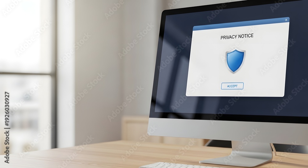 A modern computer screen displaying a clear privacy notice pop-up, signifying important data protection and user consent security concept #1926030927