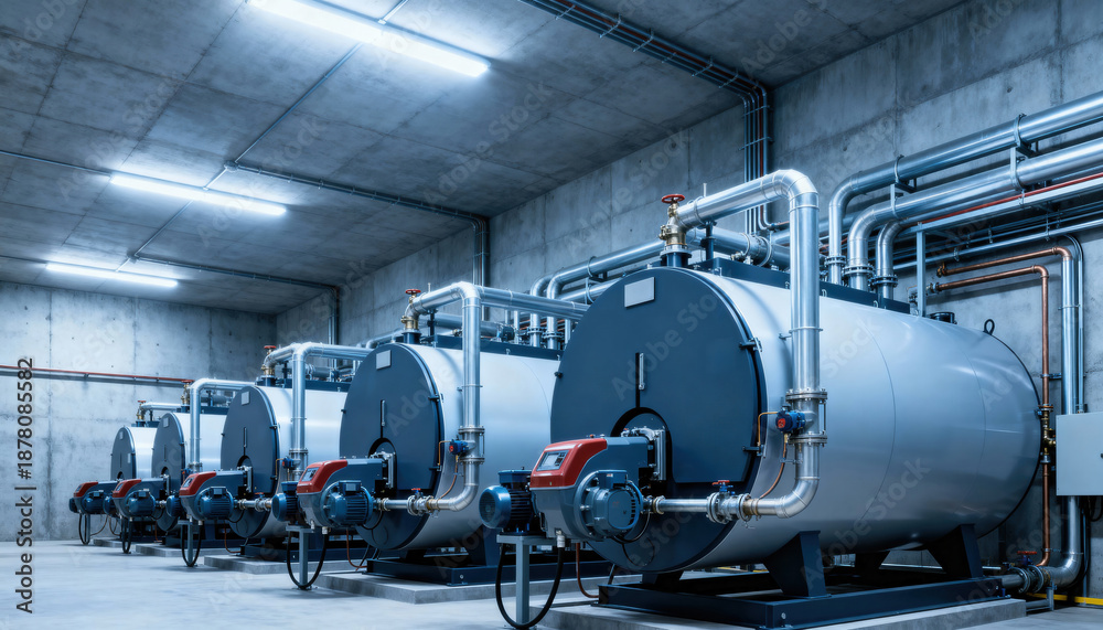 A modern gas boiler room interior in light tones with diagonal cylindrical boilers, steel pipes, and pumps for industrial facility design and corporate advertising #1878085582