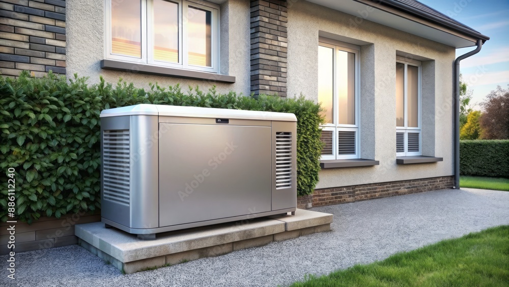 • #886112240 A modern stainless steel residential standby generator installed on a house exterior wall with a sleek and compact design.