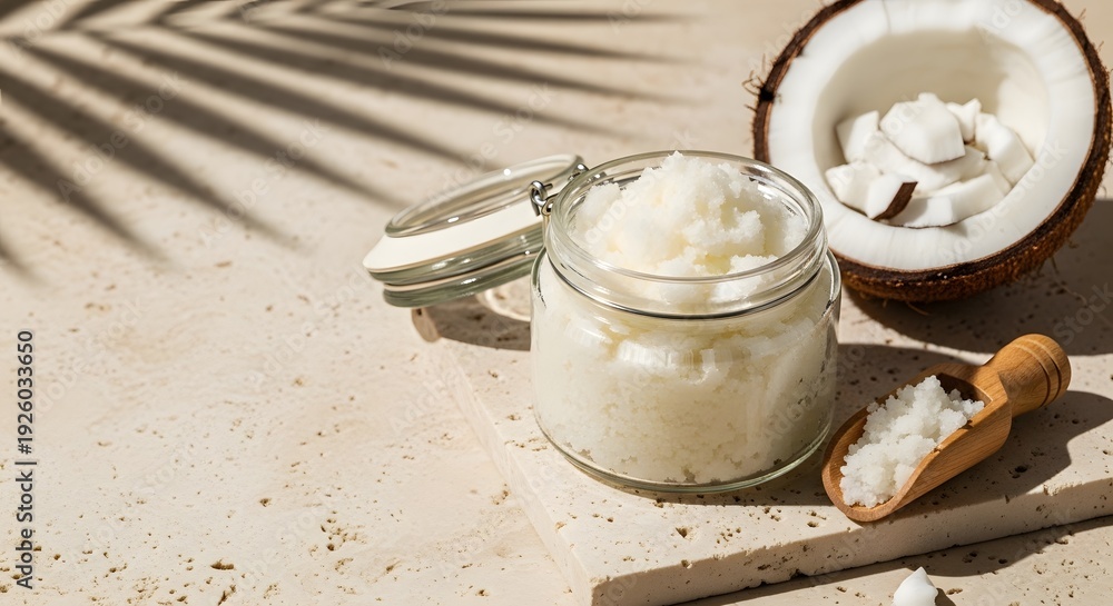 A natural coconut hand scrub in a glass jar with fresh coconut and a scoop, representing a tropical skincare self-care concept #1926033650