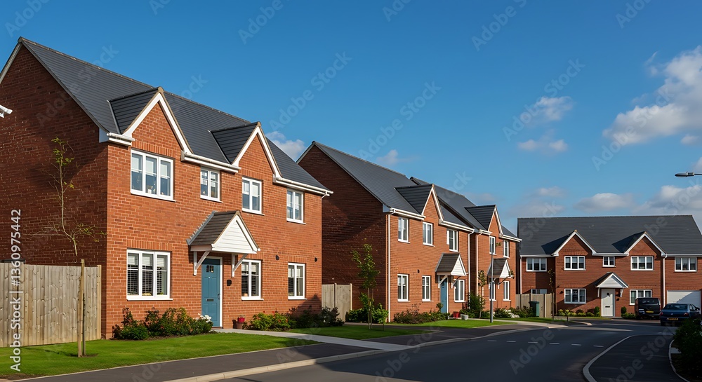 A new British estate featuring classic red-brick houses under a bright blue sky. A perfect blend of tradition and modern real estate development in the UK. #1360975442