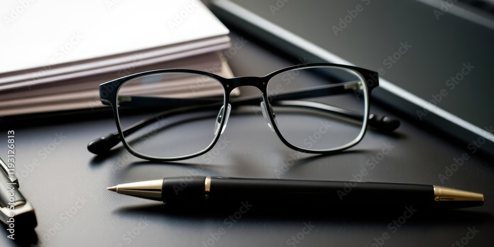 A pair of spectacles sitting on a desk with a pen lying next to them, focus, desk, stationery #1193126813