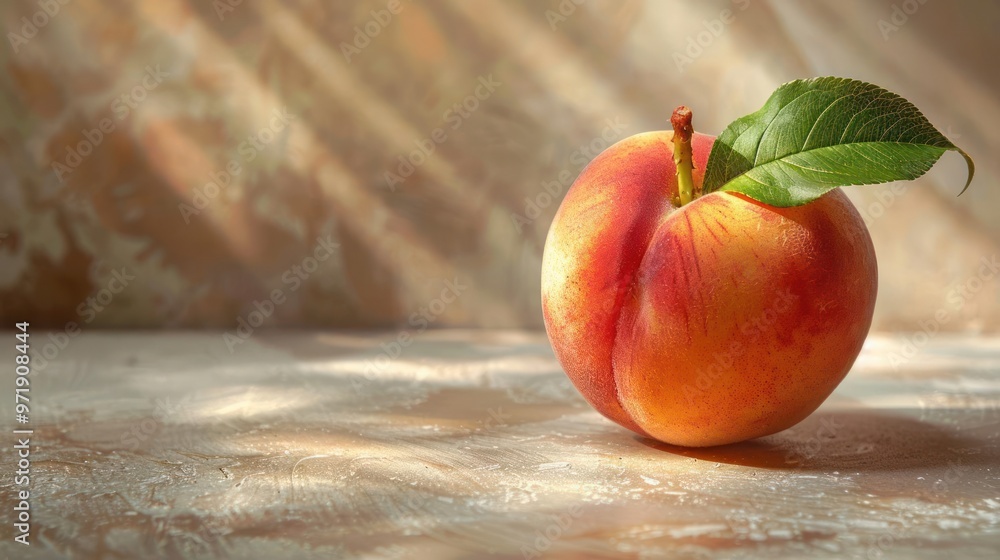 A peach with a single leaf atop it, sunlight filtering through the background. #971908444