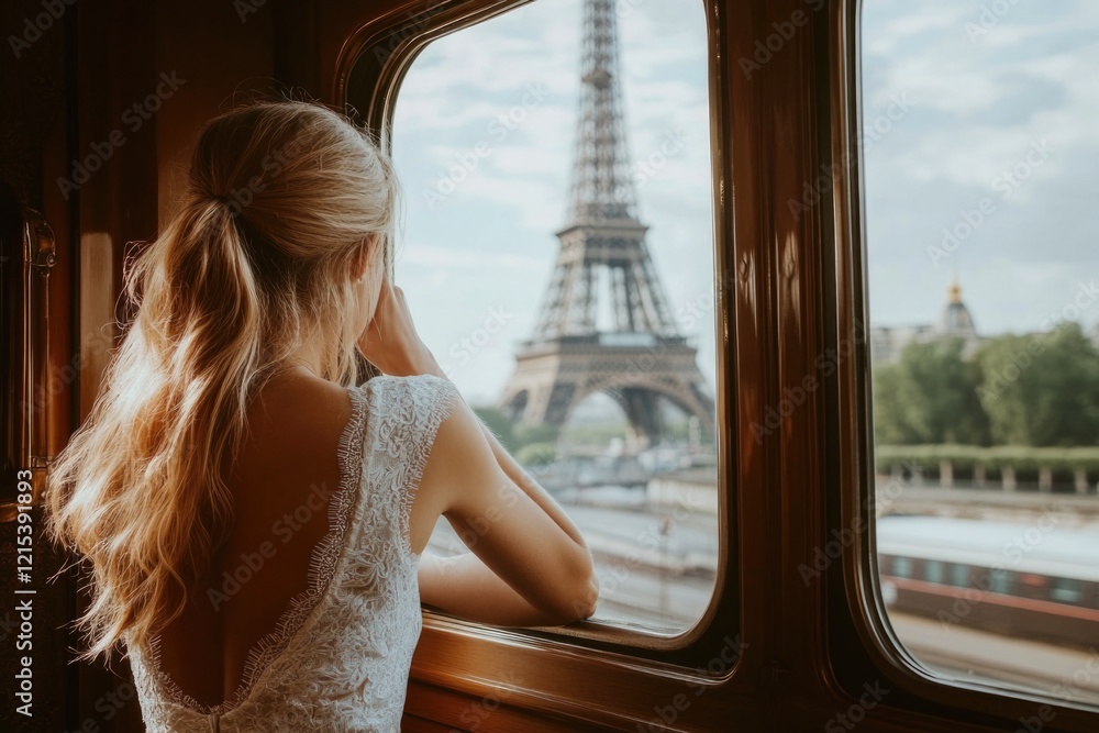 A serene image of a woman gazing out the window of a train at the Eiffel Tower, capturing feelings of longing and adventure as she embarks on her journey through Paris. #1215391893