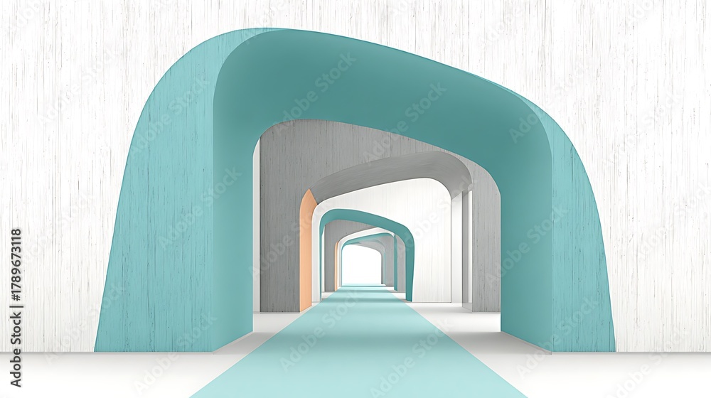 A series of arched passageways create a sense of depth and perspective, with a calming turquoise hue and a clean, white background, the design is both modern and timeless #1789673118