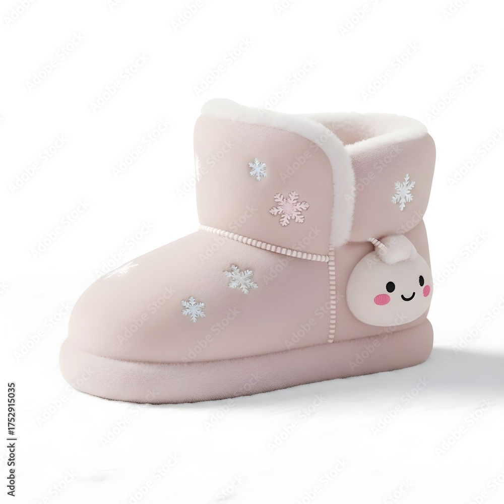 A single soft pink fluffy slipper boot for indoor home wear, featuring delicate white snowflake embroidery and a charming character tag, isolated on a white background #1752915035
