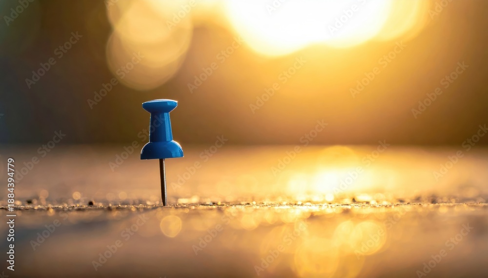 A solitary blue pushpin standing upright in a sunlit, textured environment with soft bokeh highlights. #1884394779