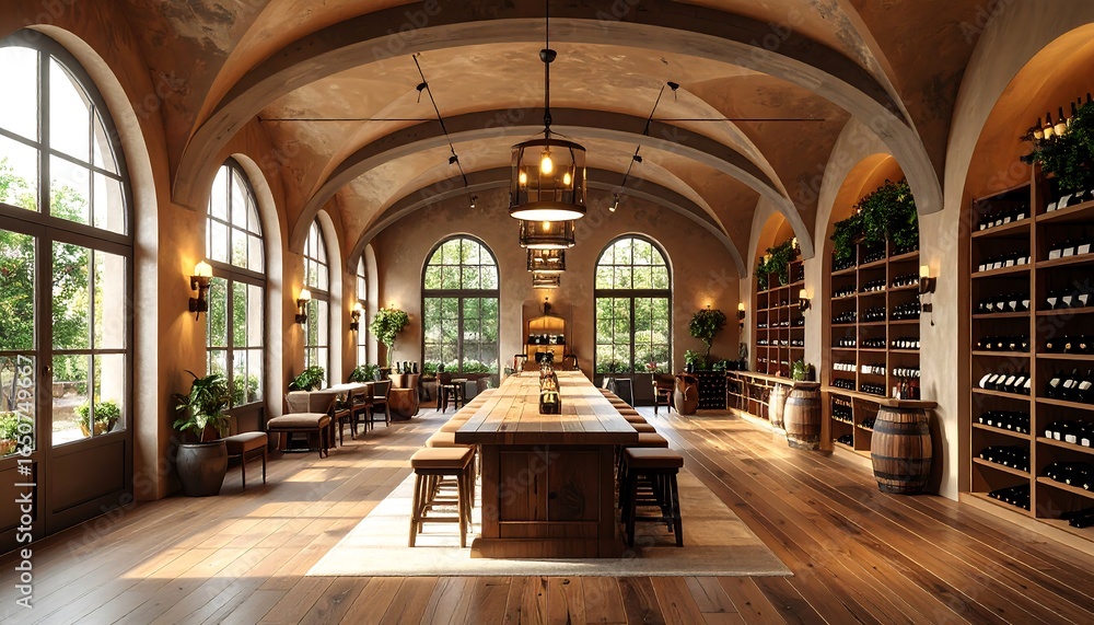 A spacious wine tasting room with arched windows and wooden furnishings. #1650749667