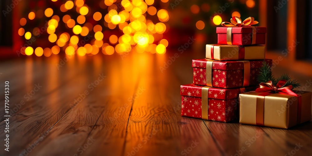 A stack of carefully wrapped presents arranged against a bokeh background on a shiny wooden surface, radiating festive warmth and anticipation. #1770915330