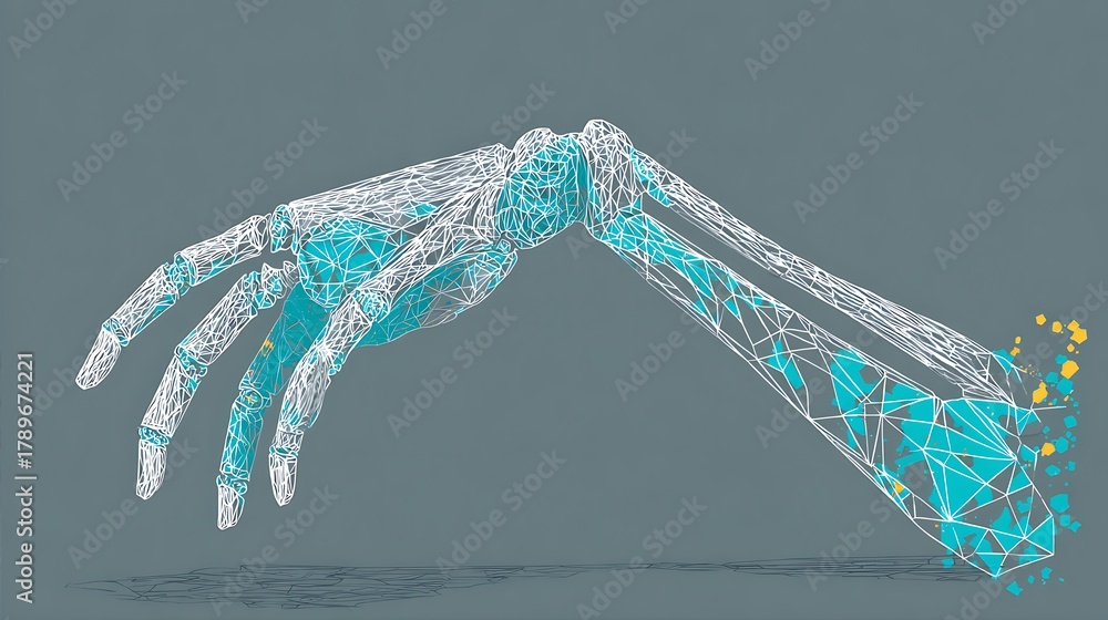 A stylized rendering of a human hand, presented as a lowpoly mesh with a vibrant blue fill and white outlines, set against a muted gray backdrop, creating a futuristic and abstract representation #1789674221