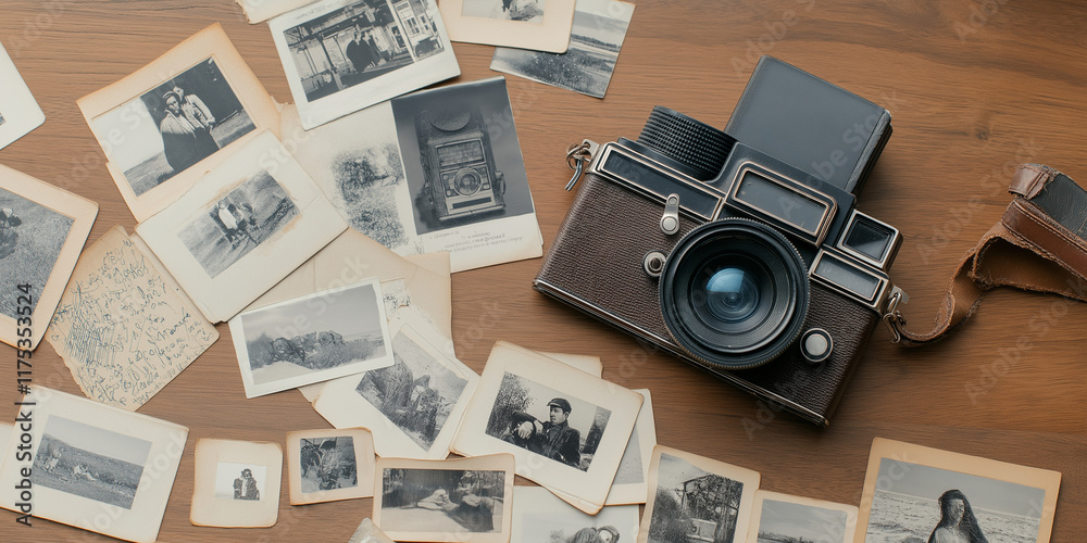 A vintage camera is beautifully captured with nostalgic black-and-white photos strewn around it, evoking memories of the past and capturing timeless moments. #1175353524