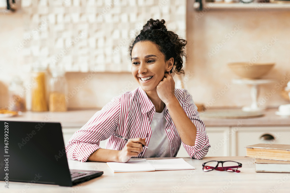 A woman sits at a wooden table with a laptop in front of her. She smiles while looking at the screen. A notebook and glasses are placed next to her. The setting is bright and casual. #1967592287
