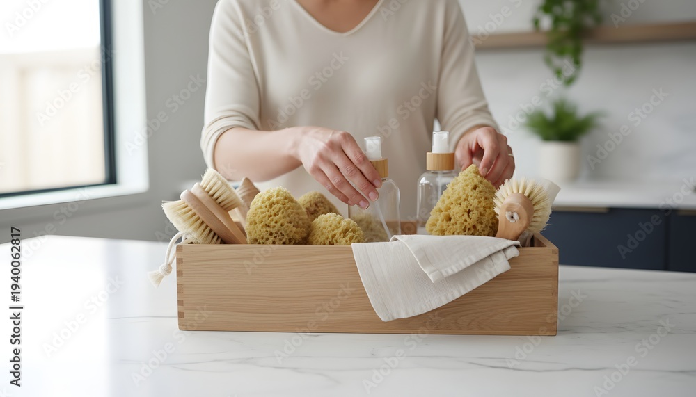 A woman sorting cleaning supplies for an eco-friendly home cleaning concept with natural sponges and brushes in a bright kitchen. #1940062817