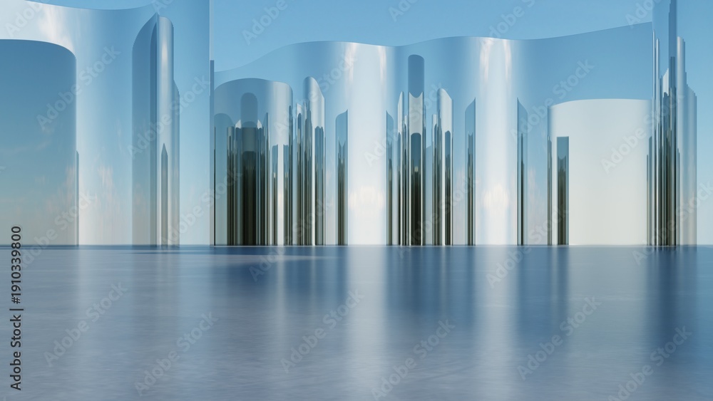 Abstract architecture background, Curved Glass or metallic Building Wall is on empty concrete floor, Scene for car presentation, Modern Exterior, 3D rendering #1910339800