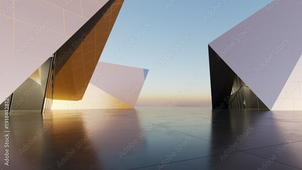 Abstract architecture background, Titanium Building, Glass or metallic Building is on empty concrete floor, Scene for car presentation, Modern Exterior, 3D rendering #1918812812