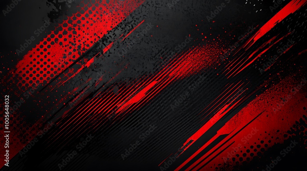 Abstract black and red grunge background with diagonal lines and dots. #1005648032