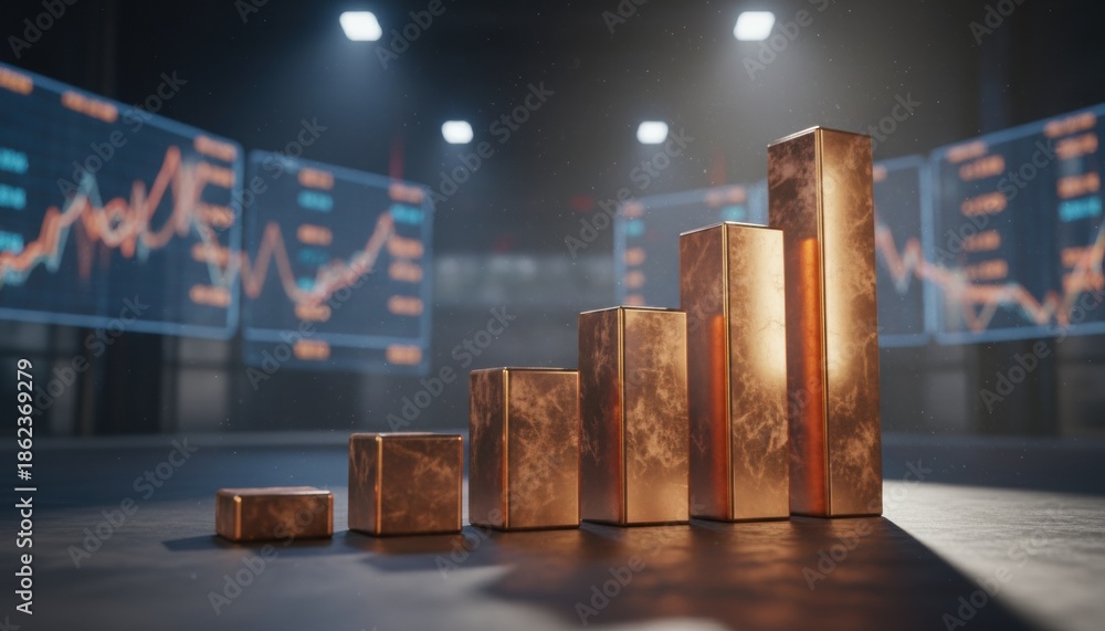 Abstract copper bar chart in front of blurred trading screens, symbolizing financial growth, investment performance metrics and rising market opportunities #1862369279