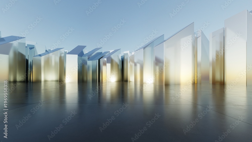 Abstract Glass or metallic architecture background, Geometric buildings are on empty concrete floor, Scene for presentation, 3D rendering #1969558318