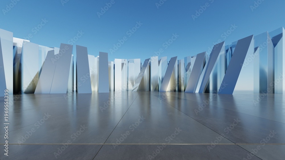 Abstract Glass or metallic architecture background, Geometric buildings are on empty concrete floor, Scene for presentation, 3D rendering #1969558399
