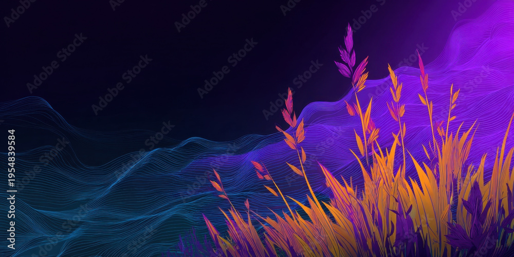 Abstract illustration of flowing blue lines and vibrant purple and orange plant stalks #1954839584