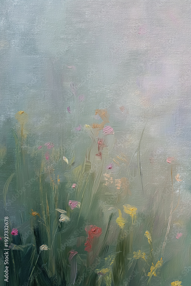 Abstract impressionist painting showing a dreamy wildflower meadow with soft pastel colors and gentle texture #1927332678