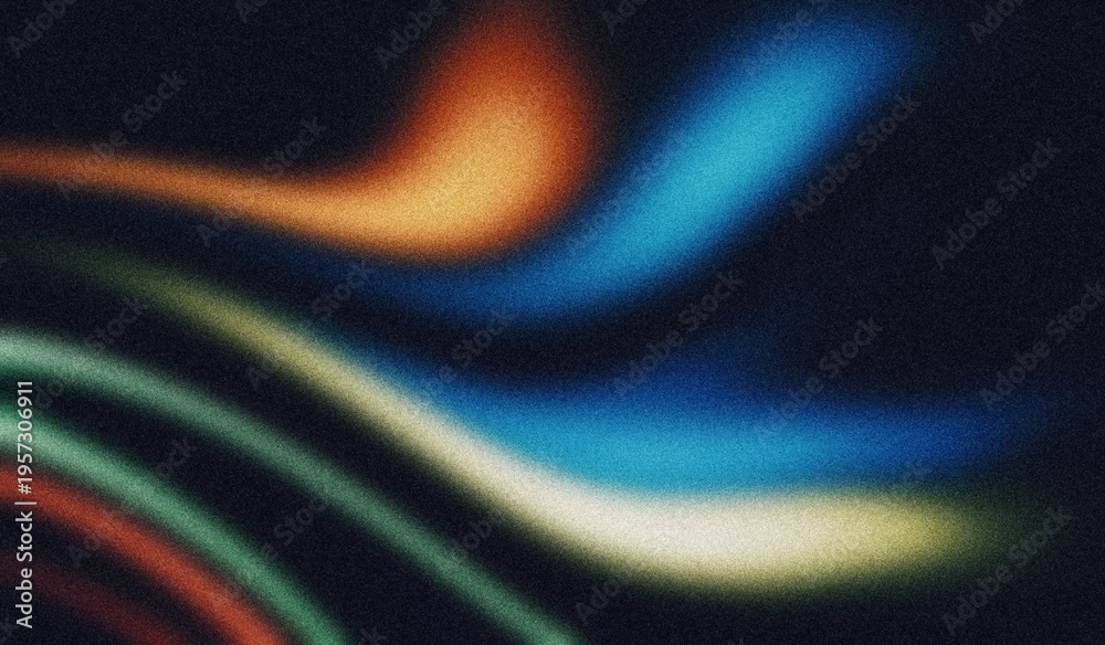 Abstract noisy glowing gradient shaped background. Dark multicolour grainy color flow wave shaped gradient web banner, webpage cover, header, poster design. Abstract rough grunge noise texture effect. #1957306911