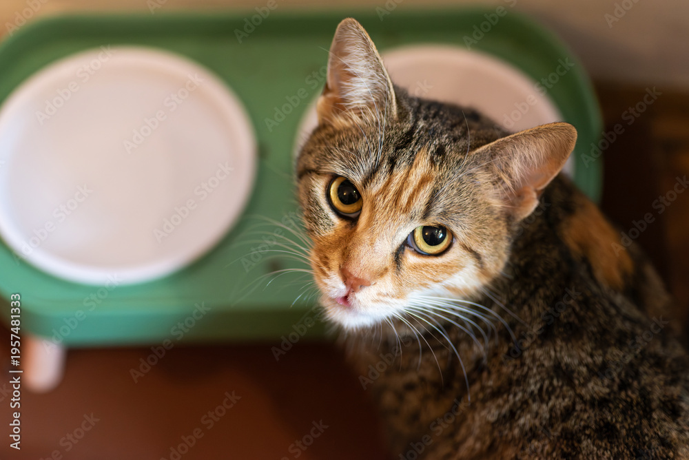 Adorable cat sitting beside food bowls calmly #1957481333