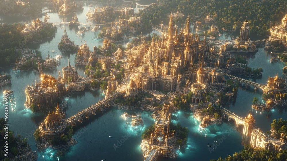 Aerial view of a majestic fantasy kingdom with towering castles and floating islands, lush green forests below, glowing waterfalls flowing between islands, ethereal lighting, Fantasy, Digital painting #980619574
