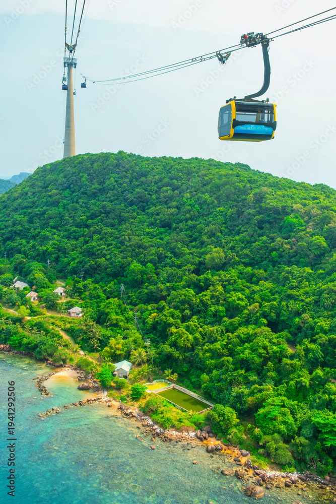 Aerial view of cable car gondola gliding over lush green island hills and turquoise sea. Longest Hon Thom cable car ride on Phu Quoc island, Vietnam. Island transportation infrastructure #1941292506