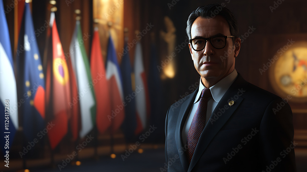 Ambassador – A diplomat standing in front of flags, 8k, hyper realistic. #1126117268