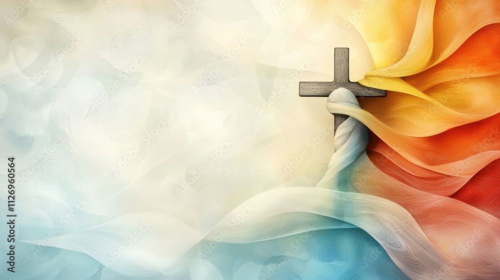 An abstract portrait depicting a figure carrying a heavy cross, symbolizing sacrifice and humility, with a background of vibrant colors and swirling patterns, evoking the themes of symbolism #1126960564