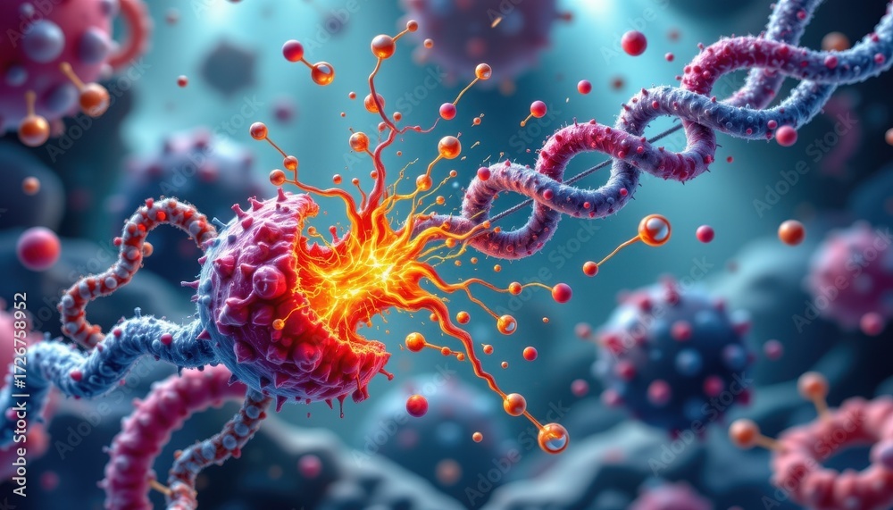 an educational medical illustration of free radicals damaging protein structures, protein folding disrupted, chains breaking apart, oxidative molecules floating around, detailed molecular environment #1726758952