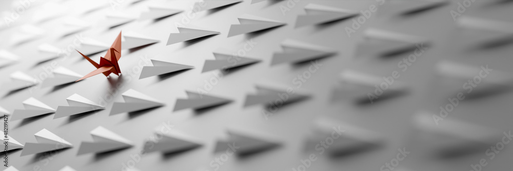 An origami bird between infinite planes all alike; leadership concepts, 3d rendering #482191427