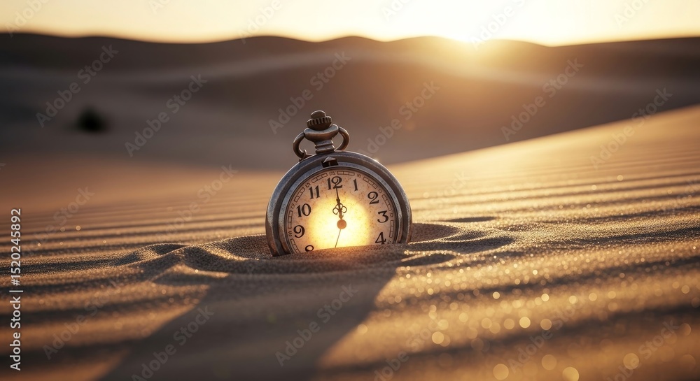 Antique pocket watch partially submerged in sand illuminated by a golden light at sunset. Warm tones and textured sand create a serene atmosphere reflecting time's passage within a desert landscape. #1520245892
