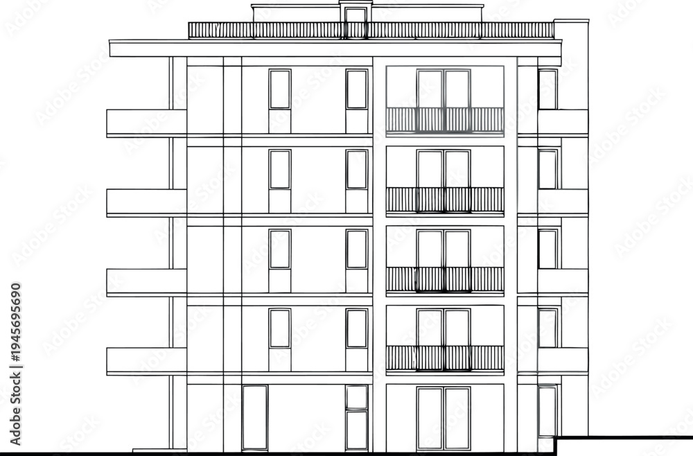Architectural drawing of a multi story building with balconies isolated on transparent background #1945695690