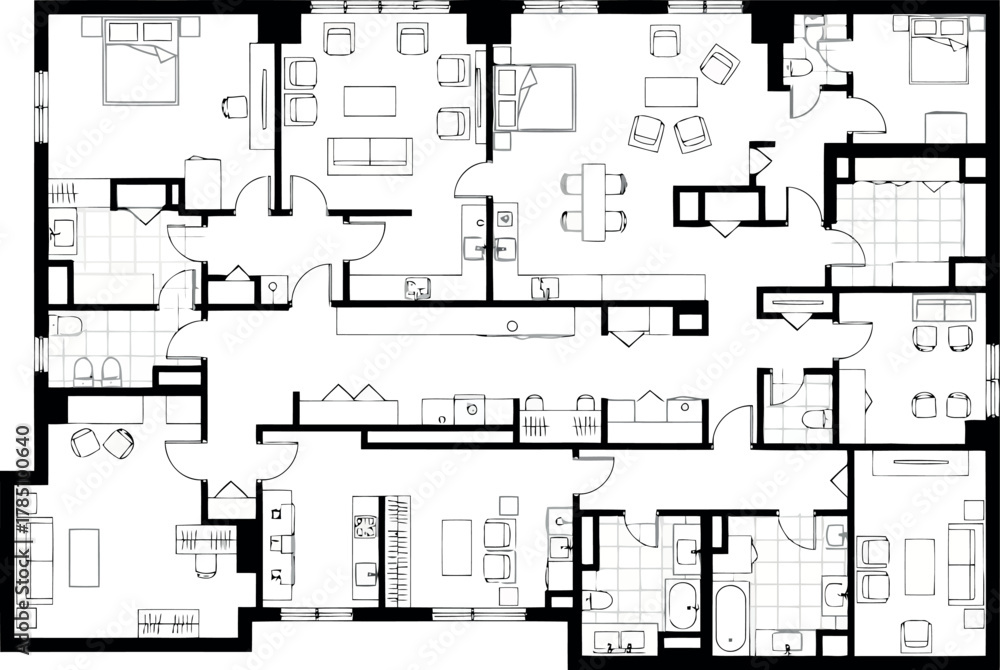 Architectural floor plan of a large apartment with multiple bedrooms and bathrooms #1785100640